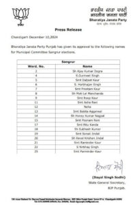 ਪੰਜਾਬ ‘ਚ ਨਗਰ ਨਿਗਮ ਚੋਣਾਂ ਨੂੰ ਲੈ ਕੇ ਸਾਰੀਆਂ ਸਿਆਸੀ ਪਾਰਟੀਆਂ ‘ਚ ਹਲਚਲ ਤੇਜ਼ ਹੋ ਗਈ ਹੈ ਅਤੇ ਆਪੋ-ਆਪਣੇ ਉਮੀਦਵਾਰ ਖੜ੍ਹੇ ਕਰਨ ਦਾ ਸਿਲਸਿਲਾ ਜਾਰੀ ਹੈ। ਵੱਖ-ਵੱਖ ਸਿਆਸੀ ਪਾਰਟੀਆਂ ਆਪਣੇ ਉਮੀਦਵਾਰਾਂ ਦਾ ਐਲਾਨ ਕਰ ਰਹੀਆਂ ਹਨ। ਇਸ ਦੇ ਤਹਿਤ ਹੀ ਸੰਗਰੂਰ ‘ਚ ਭਾਜਪਾ ਵਲੋਂ ਆਪਣੇ 19 ਉਮੀਦਵਾਰਾਂ ਦਾ ਕੀਤਾ ਐਲਾਨ ਕੀਤਾ ਗਿਆ ਹੈ।