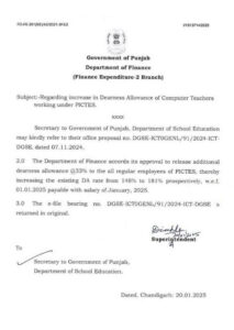 ਦੱਸਣਯੋਗ ਹੈ ਕਿ ਪੰਜਾਬ ਸਕੂਲ ਸਿੱਖਿਆ ਵਿਭਾਗ ਨੇ ਪੰਜਾਬ ਸੂਚਨਾ ਅਤੇ ਸੰਚਾਰ ਤਕਨਾਲੋਜੀ ਸਿੱਖਿਆ ਸੋਸਾਇਟੀ (PICTES) ਅਧੀਨ ਕੰਮ ਕਰਦੇ ਕੰਪਿਊਟਰ ਅਧਿਆਪਕਾਂ ਲਈ ਮਹਿੰਗਾਈ ਭੱਤੇ ਵਿੱਚ ਵਾਧੇ ਨੂੰ ਮਨਜ਼ੂਰੀ ਦੇ ਦਿੱਤੀ ਹੈ। ਨੋਟੀਫਿਕੇਸ਼ਨ ਦੇ ਅਨੁਸਾਰ, ਇਹ ਵਾਧਾ 1 ਜਨਵਰੀ, 2025 ਤੋਂ ਲਾਗੂ ਹੋਵੇਗਾ, ਯਾਨੀ ਕਿ ਨਵਾਂ ਮਹਿੰਗਾਈ ਭੱਤਾ ਇਸ ਮਹੀਨੇ ਦੀ ਤਨਖਾਹ ਵਿੱਚ ਸ਼ਾਮਲ ਕੀਤਾ ਜਾਵੇਗਾ।