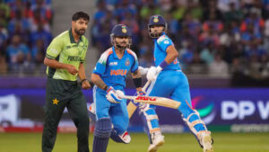 ਪਾਕਿਸਤਾਨ ਨੇ ਭਾਰਤ ਨੂੰ ਜਿੱਤ ਲਈ 241 ਦੌੜਾਂ ਦਾ ਟੀਚਾ ਦਿੱਤਾ ਸੀ। ਟੀਚੇ ਦਾ ਪਿੱਛਾ ਕਰਦੇ ਹੋਏ ਭਾਰਤੀ ਟੀਮ ਦੀ ਸ਼ੁਰੂਆਤ ਚੰਗੀ ਰਹੀ। ਭਾਰਤ ਨੂੰ ਪਹਿਲਾ ਝਟਕਾ ਪੰਜਵੇਂ ਓਵਰ ਵਿੱਚ ਹੀ ਲੱਗਾ ਜਦੋਂ ਕਪਤਾਨ ਰੋਹਿਤ ਸ਼ਰਮਾ ਸ਼ਾਹੀਨ ਅਫਰੀਦੀ ਦੀ ਸ਼ਾਨਦਾਰ ਗੇਂਦ ‘ਤੇ ਬੋਲਡ ਹੋ ਗਏ। ਰੋਹਿਤ ਨੇ 15 ਗੇਂਦਾਂ ਵਿੱਚ 20 ਦੌੜਾਂ ਬਣਾਈਆਂ, ਜਿਸ ਵਿੱਚ 3 ਚੌਕੇ ਅਤੇ 1 ਛੱਕਾ ਸ਼ਾਮਲ ਸੀ। ਰੋਹਿਤ ਦੇ ਆਊਟ ਹੋਣ ਸਮੇਂ ਭਾਰਤ ਦਾ ਸਕੋਰ 31 ਦੌੜਾਂ ਸੀ।